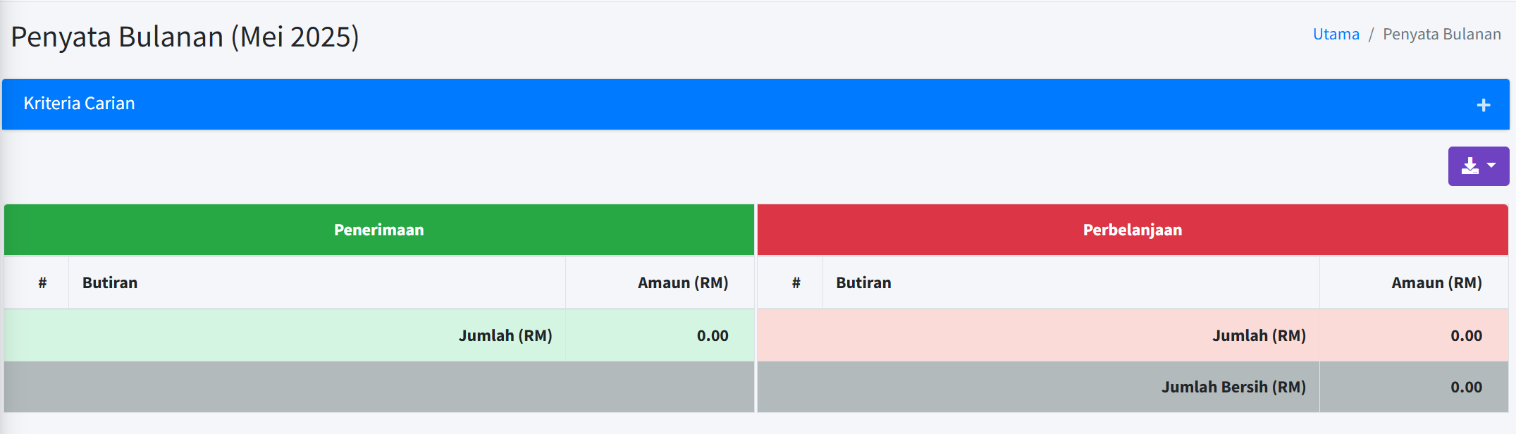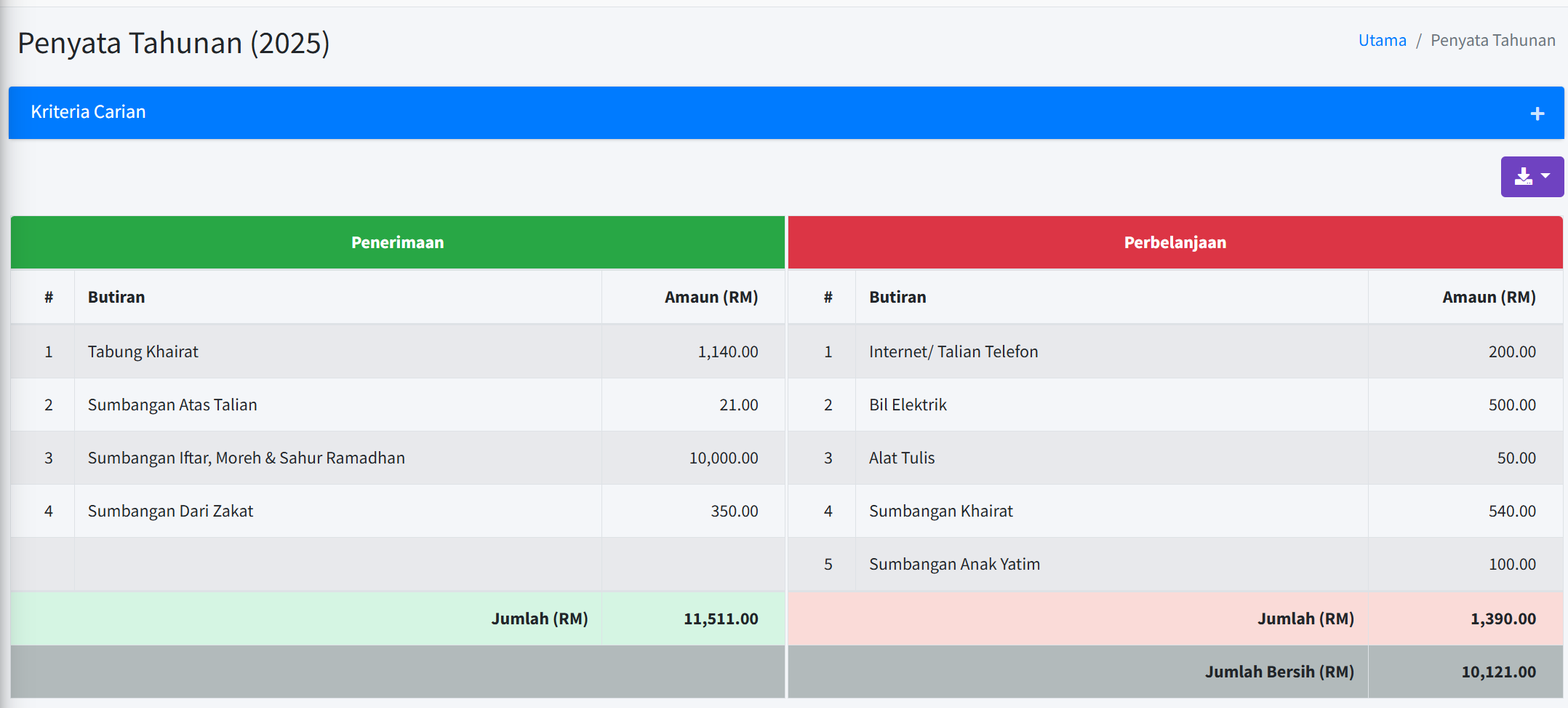 Sistem boleh eksport laporan bulanan dan tahunan.